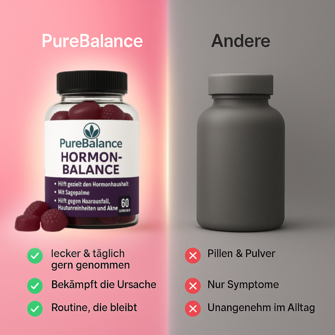 PureBalance ist zu 100% vegan, frei von Gelatine, Zuckerzusatz und künstlichen Farbstoffen. Die Gummies werden nach strengen EU-Qualitätsstandards (GMP, ISO, HACCP) hergestellt. Damit garantieren wir höchste Reinheit und Sicherheit. Anders als Medikamente greift PureBalance nicht in deinen Hormonhaushalt ein, sondern unterstützt sanft, indem es die DHT-Belastung an der Haarwurzel reduziert. Das macht es zu einer natürlichen und sicheren Lösung, die sich bedenkenlos in deinen Alltag integrieren lässt.